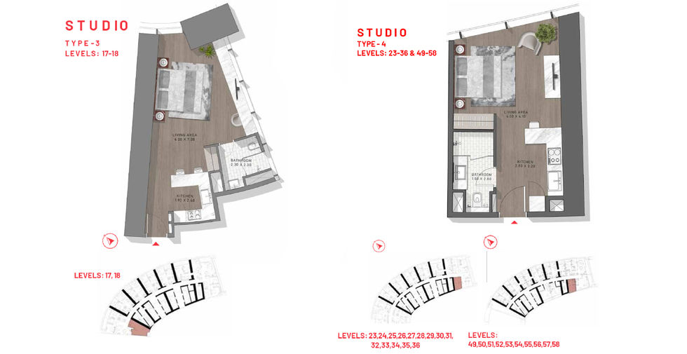 Căn Studio có 13 loại Floor Plan, giá từ AED 788,000 (USD 215,000 / VND 5,32 tỷ), diện tích trung bình 33m2.